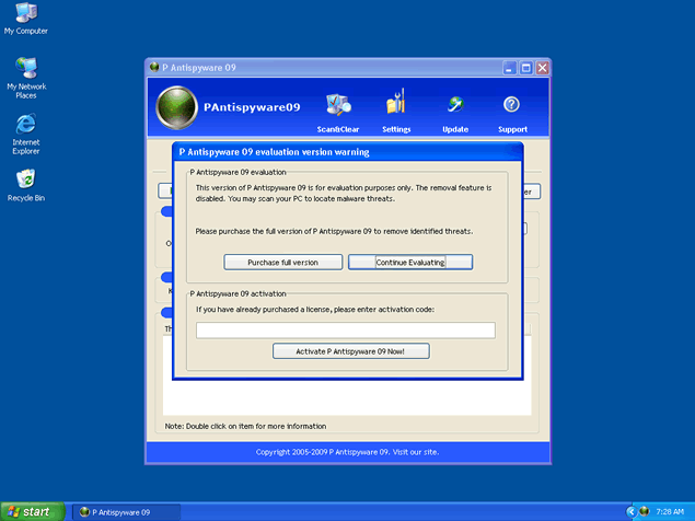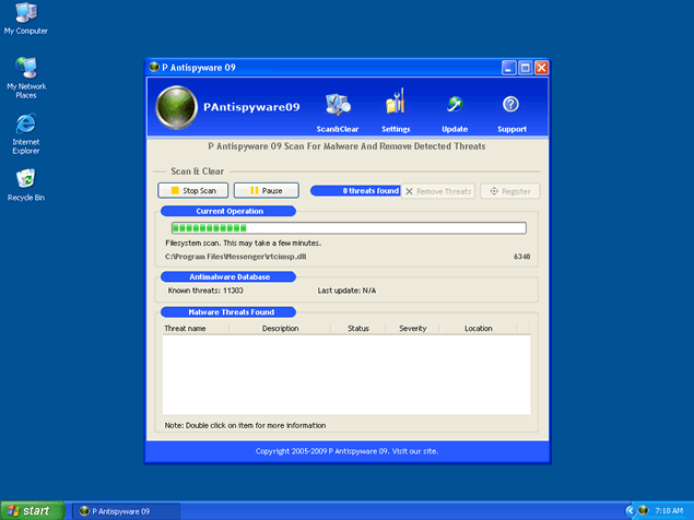 This scan is accompanied by numerous reports of infections and it is suggested that you download and install P Antispyware 09. Once this application has been installed it will be configured to start automatically when Windows loads. The scan that occurs may report back fictitious results, in an attempt to intimidate the user into purchasing the counterfeit "full" version of P Antispyware 09.