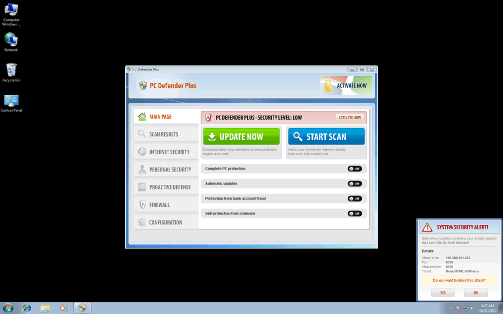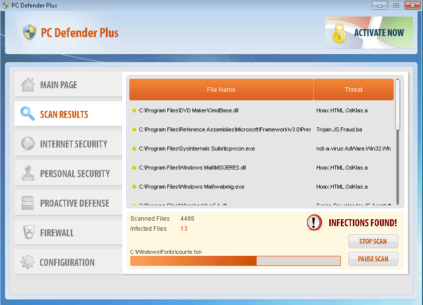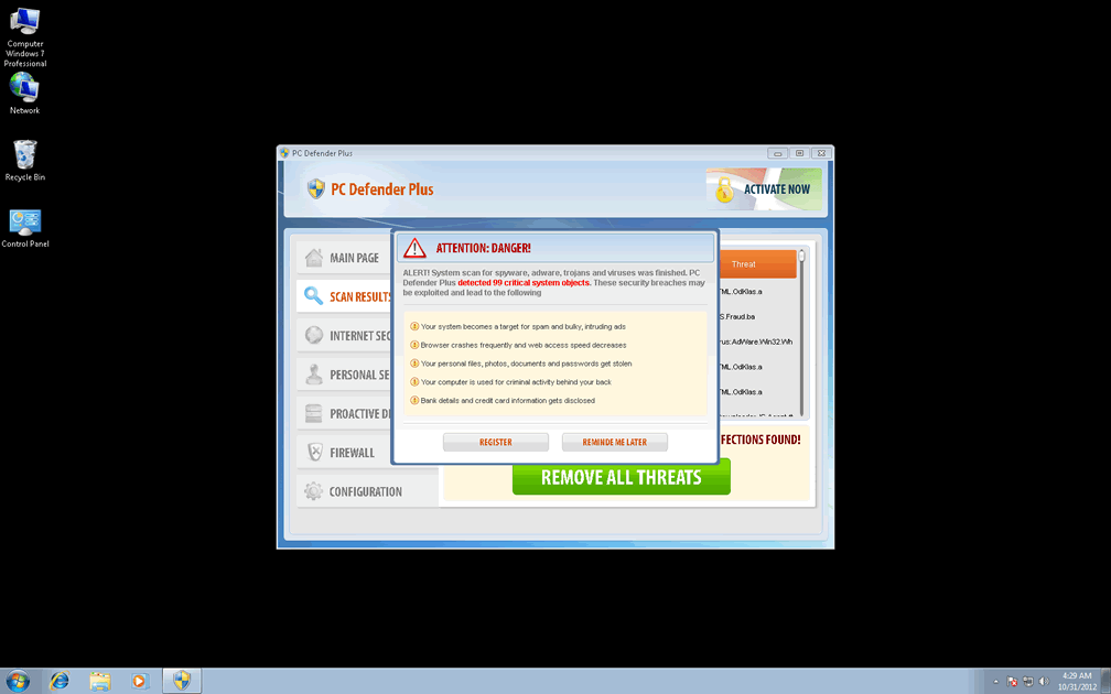 PC Defender Plus is one of an older branch of still dangerous fake anti-malware programs from the FakeRean group, a collection of scamware products that include numerous brand names and different visual designs. PC Defender Plus's particular branch includes other members like Ultimate Defender, SystemDefender, IE Defender, XP Defender, Advanced XP Defender, WinDefender2008, PCTotalDefender, PC Defender 2008, Personal Defender 2009, WinDefender 2009, Perfect Defender 2009, Total Defender, Malware Defender 2009, WinPC Defender, PC Privacy Defender, Smart Defender Pro, Rogue.UltimateDefender, FraudTool.LastDefender.b and Security Defender Pro 2015.