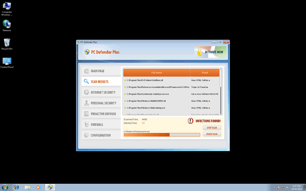PC Defender Plus promotes itself as a solid anti-malware product that's detecting malware on your computer almost continuously, but a combination of casual observation and common sense should be capable of telling you that any of PC Defender Plus's warnings are faked. While PC Defender Plus wants you to spend money to make its various pop-ups and automatic scans quiet down, SpywareRemove.com malware experts discourage this waste of money since PC Defender Plus doesn't have any features that are worth your money and can be removed without purchasing PC Defender Plus.