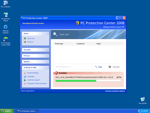 PC Protection Center 2008, also known as PCProtectionCenter 2008, is a rogue anti-spyware program and part of the Power Antivirus 2009, XP Antivirus and Antivirus 2009 family. PC Protection Center 2008 was created to trick users to purchase its full version to supposedly remove spyware threats. PC Protection Center 2008 may install in your computer, with the aid of a Trojan called Zlob which is most commonly found on fake video codec downloads. As soon as you're infected with Zlob, it may flood your system with popups and fake warning alerts stating that your computer is infected with spyware. PC Protection Center 2008 may use its system scanner to emulate a scan and report a rogue list of spyware infections as a result.