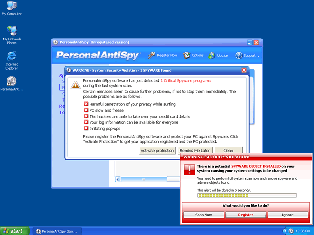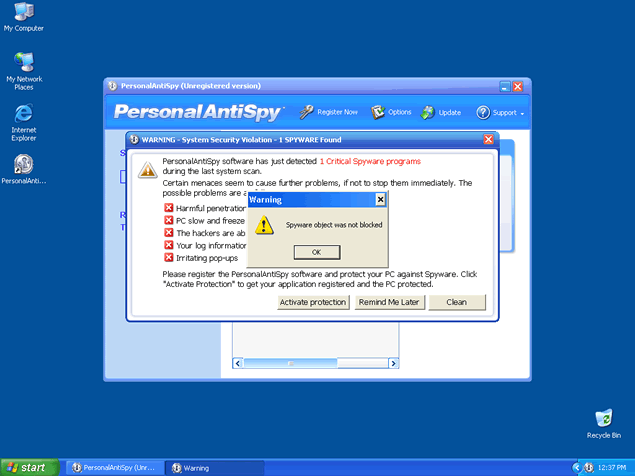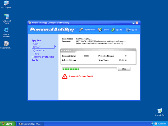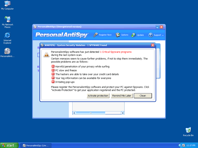 PersonalAntispy is a rogue antispyware application. PersonalAntispy is often downloaded and installed by a Trojan, through browser security holes, or via other unconventional and unethical mechanisms. Once installed, PersonalAntispy will display notifications of imaginary security and privacy risks in its attempts to get the user to purchase the full version and may generate system slowdown and instability. This program can be extremely difficult to manually remove. PersonalAntispy is a clone of Win Antispyware.