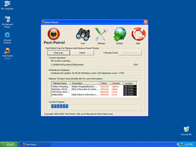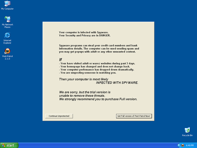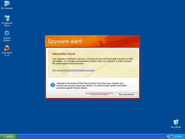 Pest-Patrol is a rogue anti-spyware application. Pest-Patrol is often downloaded and installed by a Trojan, through browser security holes, or via other unconventional and unethical mechanisms. Once installed, Pest-Patrol will display notifications of imaginary security and privacy risks in its attempts to get the user to purchase the full version and may generate system slowdown and instability. This program can be extremely difficult to manually remove. Pest-Patrol attempts to mislead people into believing that it is actually CA PestPatrol (a legitimate antispyware application).