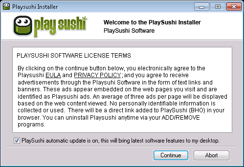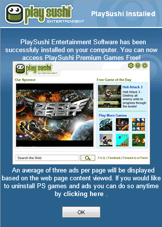 PlaySushi is an adware-supported platform that offers plenty of Flash games. Users may acquire PlaySushi via freeware downloads or by downloading it from their official website at playsushi.com. Once installed, PlaySushi will give you access to many Flash games for any taste, but it also starts keeping track of your online activities. PlaySushi will collect information such as your IP address, browsing history, and habits, etc. Later, PlaySushi starts displaying annoying advertisements that are mostly in-text ads. Since ads by PlaySushi are based on your online preferences, it is not recommended to click them. Also, PlaySushi ads might redirect you to third party websites or ones that promote questionable content. In case you get redirected to a dubious web location, it is not advised to download anything. You may end up installing more adware-related content and make your computer more sluggish.