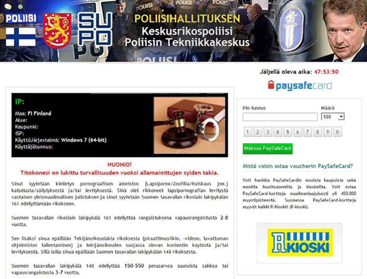| 1 | Polliisihallituksen Keskusrikospoliisi Poliisin Tekniikkakeskus HUOMIO! Titokonesi on lukittu turvallisuuden vuoksi allamainittujen syiden takia. Sinut syytetään kielletyn pornograafisen aineiston (Lapsiporno/Zoofilia/Raiskaus jne.) katselusta/säilytyksestä ja/tai levityksestä. Sinä olet rikkoneet lapsipornografian levitystä vastaisen yleismaailmallisen julistuksen ja sinut syytetään Suomen tasavallan rikoslain lakipykälän 161 edellyttämään rikokseen. Suomen tasavallan rikoslain lakipykälä 161 edellyttää rangaistuksena vapausrangaistusta 2-8 vuotta. Sen lisäksi sinua epäillään Tekijänoikeuslakia rikoksesta (piraattimusiikin, -videon, luvattoman ohjelmiston tallentaminen) ja tekijänoikeuden suojassa olevan kontentin käytöstä ja/tai levityksestä. Sillä lailla sinua epäillään Suomen tasavallan lakipykälän 148 rikoksesta. Suomen tasavallan lakipykala 148 edellyttää 150-550 perusarvoa suuruista sakkoa tai vapausrangaistusta 3-7 vuotta. Tietokoneesi avulla suoritettiin luvaton pääsy suljettuihin tietoihin ja valtakunnallisesti merkittäviin tietoihin tietoverko Internrtissä. Luvaton pääsy sinä olet suorittanut tahallaan itsekkäistä syistä tai laiton pääsy yritettiin suorittaa tietokoneestasi sinun tietämättä ja ilman suostumustasi, koska tietikoneessasi on haittaohjelmia. Sillä lailla sinua epäillään ennen tutkinnan toimittamista Suomen tasavallan rikoslain lakipykälää 215 tahattomasta rikoksesta (Laki huolimattomasta ja leväperäisestä atk-laitteiden/tietokoneen käytöstä). Suomen tasavallan rikoslain lakipykälä 215 edellyttää rangaistuksena €100.000 suuruista sakkoa ja/tai vapausrangaistusta 5-8 vuotta. Sen lisäksi tietokoneessasi olevien tietojen analyysin aikana on todettu että tietokoneesi kautta jatkuvasti levitetään roskaposti, jonka sinä olet suorittanut tahallaan itsekkäistä syistä tai roskapostin levittäminen yritettiin suorittaa tietokoneestasi sinun tietämättä ja ilman suostumustasi, koska tietikoneessasi on haittaohjelmia. Tämä roskaposti levittää haittallista ohjelmistoa ja kellettyä pornograafista aineistoa. Sillä lailla sinut syytetään ennen tutkinnan toimittamista Suomen tasavallan rikoslain lakipykälän 301 tahattomasta rikkomisesta (Laki roskapostin ja haittallisen ohjelmiston (viiruksien) levittämisen taistelusta). Suomen tasavallan rikoslain lakipykälä 301 edellyttää rangaistuksena €250.000 suuruista sakkoa ja/tai vapausrangaistusta 5 vuoteen asti. Kiinnitämme huomiotasi siihen että tällä hetkellä sinun henkilöllisyytesi ja paikkasi selvitetään, 96 tunnin aikana sinua vastaan nostetaan rikosasia koskien edellä mainittuja rikoslain pykäliä. Rikosasian aineisto luovutetaan oikeuteen. Mutta Suomen tasavallan rikoslain korjauksien (i o. heinäkuuta 2013) ja Ihmisoikeuksien julistuksen mukaan rikkomisesi voidaan pitää tahattomina (jos nämä rikkomiset on tehty ensimmäisen kerran) ja sinut ei saateta rikosvastuuseen. Tämä ehto on mandollista toteuttaa jos sinä maksat sakon valtion kassaan (Internet-verkon kyberavaruuden sujausta koskevien hankkeiden kannatusta varten). Sakot on maksattava 48 tunnin aikana rikoksen jäkeen. 48 tunnin kuluttua seuraavan 48 tunnin aikana on käynnissä automaattinen sinua koskevien tietojen keräily ja sinua vastaan nostetaan rikosasia. Sakon määrä on €100. Sinä voit maksaa laskun voucherien PaySafeCard Kun sakko on maksettu, tietokonenne tulee vapaasti käyttöön 24 tunnin aikaan sen jälkeen, kun maksu pääse viralliselle tilille. Sen jälkeen sinun on poistettava 7 päivän kuluessa kaikki tietokoneeseesi kuuluvat häiriöt. Siinä tapauksessa jos häiriöt ei poisteta tietokonesi tukitaan taas ja sinua vastaan nostetaan rikosasia (ilman mandollisuutta maksaa sakkoa). Kiinnitämme huomiotasi siihen että sinun on syötettävä luotettavat rahavoucherien koodit sakon maksaessa eikä saa vaihtaa rahaksi syötetyt voucherit maksun jälkeen. Siinä tapauksessa jos syötettiin väärät rahavoucherien koodit tai yritettiin mitätöidä rahavoucherit maksun jälkeen edellämainittujen rikkomisten lisäksi sinut syytetään huijauksesta (Suomen tasavallan rikoslain lakipykälä 377; tämä pykälä edellyttää vapausrangaistusta 1-3 vuotta) ja sinua vastaan nostetaan rikosasia. |
