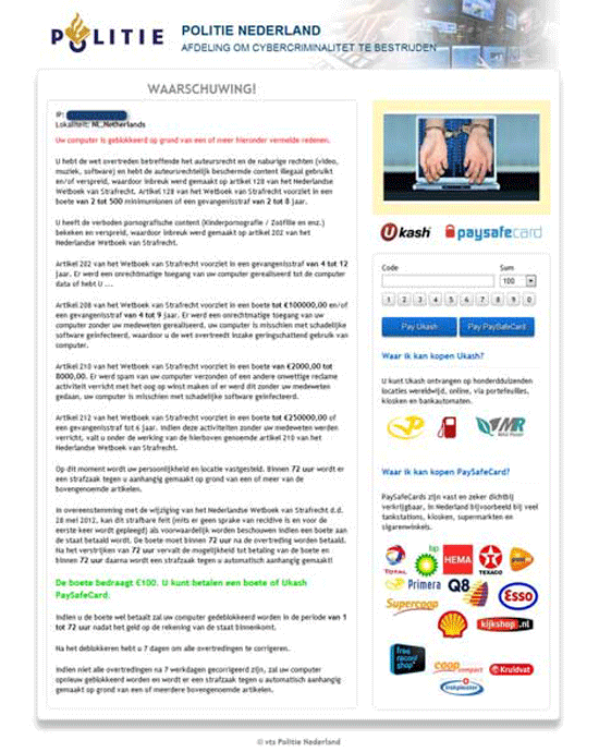 Politie Nederland Ransomware's warnings serve only one purpose: a cheap way to scam its victims for a fake legal fine. Similar ransomware attacks usually can be identified with ease by noticing the improper transaction methods preferred, such as Ukash, Paysafecard or other voucher systems that wouldn't be used by your government as a means of collecting its legal fines.