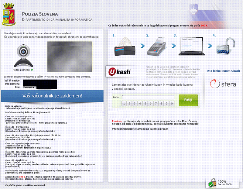 Polizia Slovena Ransomware may try to pretend to be sent by your local law enforcement, but Polizia Slovena Ransomware's real origins lie in the same roots as ransomware Trojans like the Türk Polisi Virus, the Polizei Control Department Virus, the Poliisi Tietoverkkorikos Tutkinnan Yksikkö Ransomware and the France Ministère de l'Intérieur Virus. Trojans from the Reveton family often are used to load the nationality-specific fake pop-up alerts from Polizia Slovena Ransomware and related ransomware Trojans, with the language, legal threats and logos always changed to match the country of the PC in question. Thus, only PCs that are found to be in Slovenia (as noted in their IP addresses) will suffer from Polizia Slovena Ransomware attacks, while France deals with the France Ministère de l’Intérieur Virus, etc.