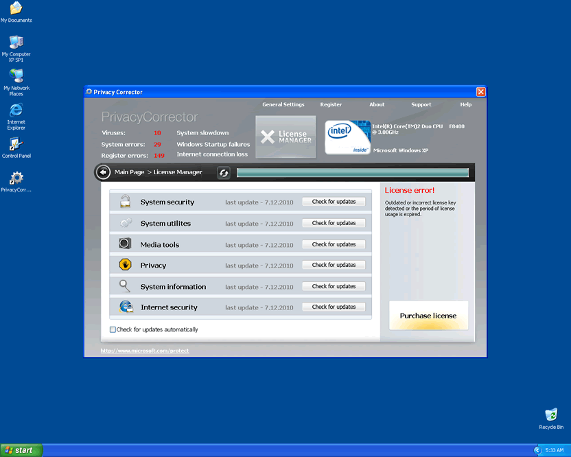 Privacy Corrector (or PrivacyCorrector) is rogue software used by cyber criminals to pilfer your hard-earned money. PrivacyCorrector is designed to be a fake malware remover pretending to be a genuine product. Once this rogue has infected the system it will bombard the unwary user with popup ads claiming the system has been infected with malware. This is a malicious attempt to get users to buy Privacy Corrector, which gets falsely advertised to get rid of the so-called threats. Do not fall for this blatant trickery, it is a scam. Remove Privacy Corrector and all other threats using a reliable, updated malware remover.