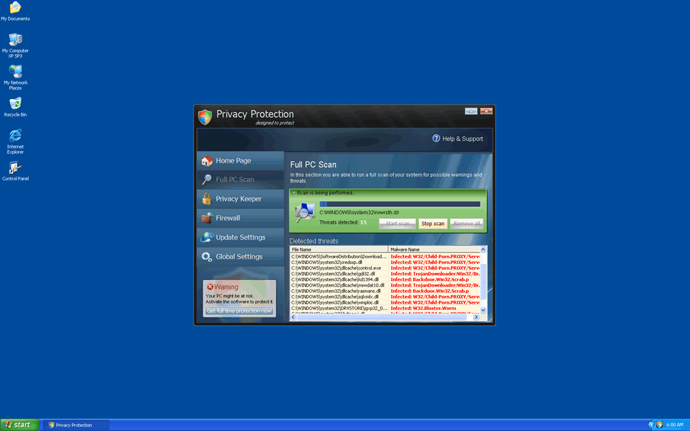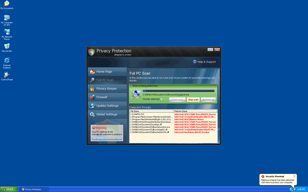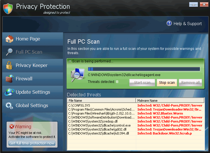 Privacy Protection is a copy of other types of fake anti-malware programs from the FakeRean family of rogue security programs. Although Privacy Protection claims to be able to protect your PC from spyware and even more dangerous types of malicious programs, SpywareRemove.com malware researchers have found that Privacy Protection lacks any genuine PC threat detection or removal features. Alerts and error messages from Privacy Protection are meant to induce you into spending money on a registered version of Privacy Protection, but this action is, naturally, inadvisable. Instead, if you find that Privacy Protection has infected your PC, you should remove Privacy Protection with a competent security program and, if necessary, a fake activation key.