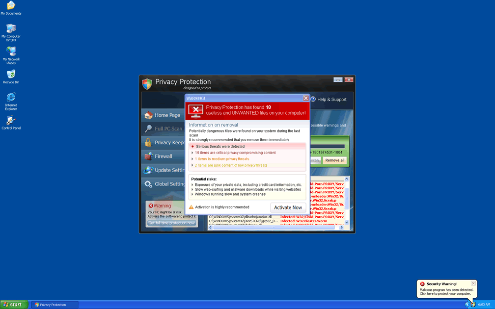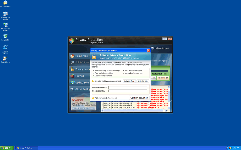 However, you can remove Privacy Protection with a suitably-powerful anti-malware application, as long as you use Safe Mode or an external Windows boot source to stop Privacy Protection from launching itself. The freely-circulated code 'U2FD-S2LA-H4KA-UEPB' can also be useful to take a registration process for Privacy Protection, which may reduce its attacks in the meantime. Among the members of the huge family of Privacy Protection, we can mention Antivirus 2008 Pro, Windows Antivirus 2008, Vista Antivirus 2008, Antivirus XP 2008, PC Clean Pro, Antivirus Pro 2009, AntiSpy Safeguard, ThinkPoint, Spyware Protection 2010, Internet Antivirus 2011, Palladium Pro, XP Anti-Virus 2011, CleanThis, Rogue.Vista Antivirus 2008, XP Home Security 2012, XP Security 2012 and AntiVirus PRO 2015.