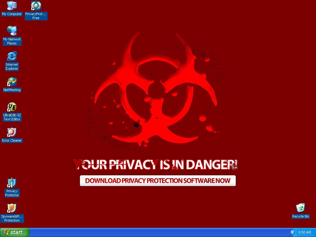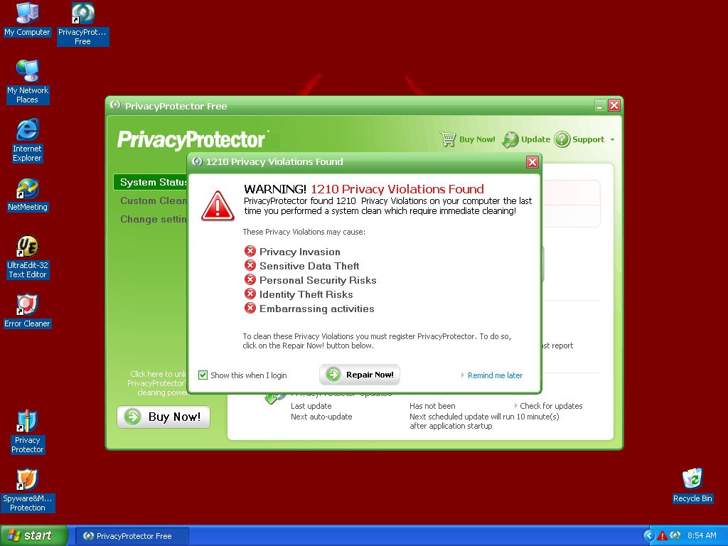 PrivacyProtector is a rogue drive cleaner application that may scare you by showing fake notification that your computer is heavily infected with spyware. The makers of PrivacyProtector seek to lure you into purchasing the full version of PrivacyProtector. PrivacyProtector rogue cleaner may be secretly installed on your machine without your knowledge or consent. PrivacyProtector may come bundled with other malware or through various security vulnerabilities. PrivacyProtector is known to be affiliated with other malicious Trojans.
