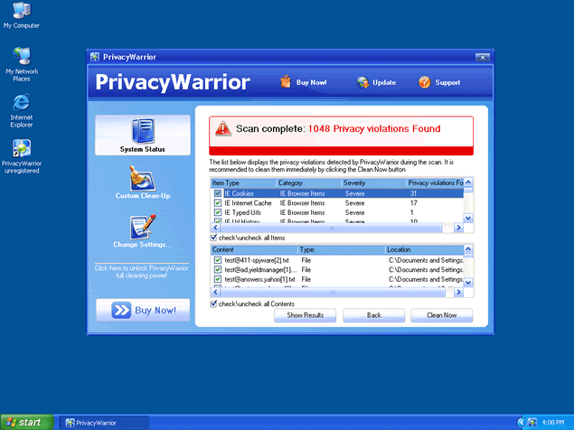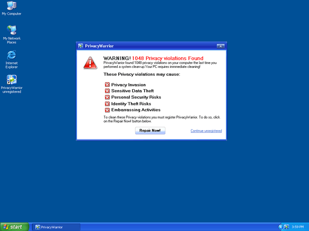 Do not click on any link provided by PrivacyWarrior. If you do, you'll be redirected to PrivacyWarrior's website (PrivacyWarrior.com) or another rogue website to download and purchase the full version of PrivacyWarrior. PrivacyWarrior "System scan" messages may continue to try to recreate itself after reboot.