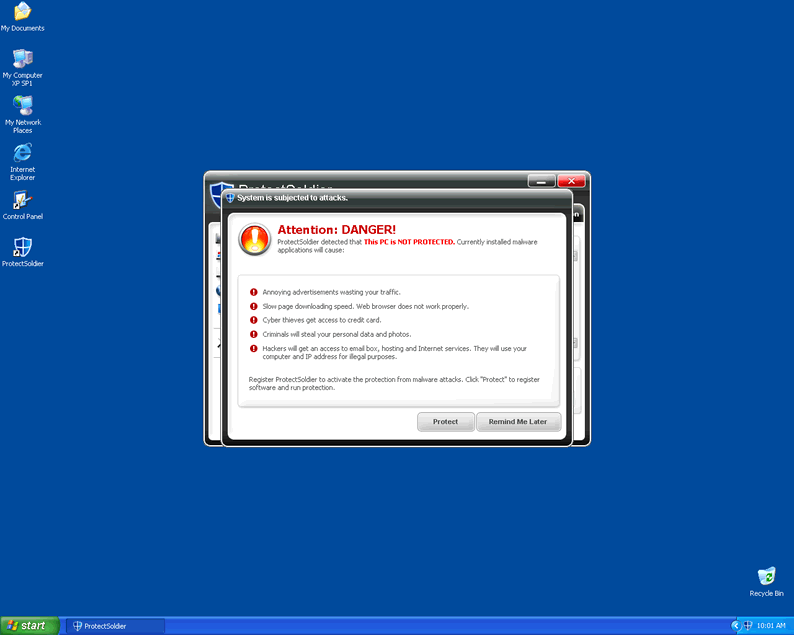 ProtectSoldier (Protect Soldier) is a fake security application that comes from the WiniGuard family of rogue anti-spyware programs. ProtectSoldier uses scare tactics in the form of false popup notifications and bogus system scan results to coerce computer users into purchasing a full version of ProtectSoldier.