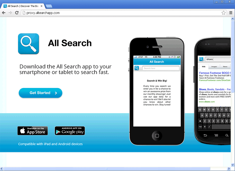 Proxy.allsearchapp.com is a site that promotes All Search, a mobile phone and tablet add-on that supposedly assists with your online searches. SpywareRemove.com malware researchers haven't found any especially negative elements associated with All Search, but there are cases of browser hijackers promoting Proxy.allsearchapp.com with malicious changes to any compromised PC's web-browsing settings. Browser hijacks of any sort, even when they involve the promotion of apparently safe sites like Proxy.allsearchapp.com, always are corrosive to your computer's online security, and any PC threat related to Proxy.allsearchapp.com should be deleted with anti-malware products with all reasonable alacrity.