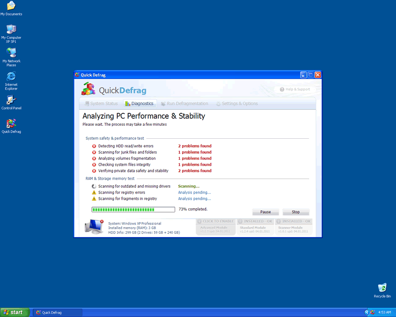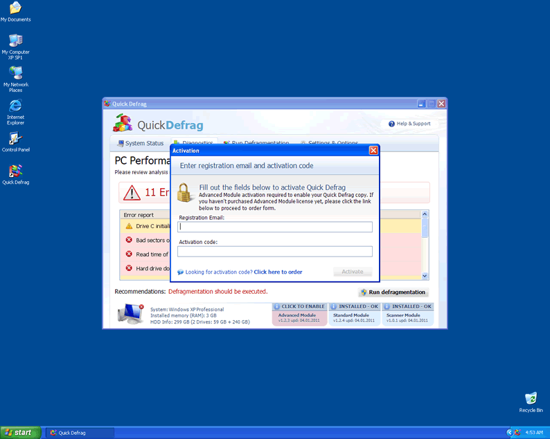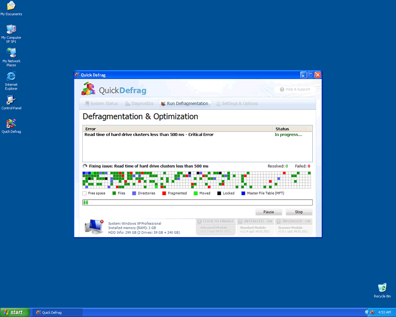Quick Defrag or QuickDefrag is a fake system optimization program advertised on rogue websites and distributed by sneaky Trojans. Quick Defrag is from the same family as HDD Tools and they both use fake system scanners and pop-up alerts to convince victims that their systems are riddled with dangerous errors.