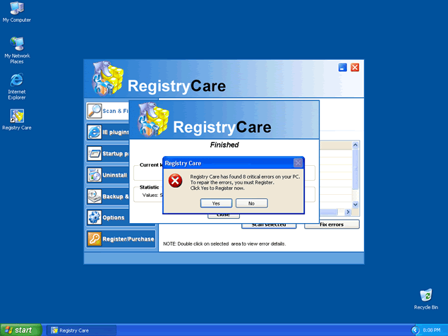 RegistryCare is a fake registry cleaner program. RegistryCare claims to remove malicious registry entries but it does not do anything remotely similar to this claim. RegistryCare may be installed and/or downloaded through a Trojan infection. Usually this Trojan is downloaded through a fake video codec or malicious website. RegistryCare, once installed, will display annoying popups and alert messages to scare you into purchasing the full RegistryCare program. RegistryCare is very difficult to more manually.