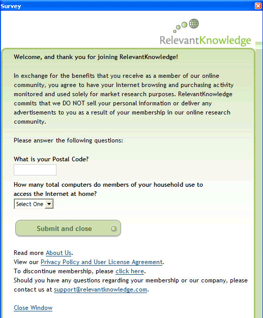 Also known by Relevant Knowledge, RelevantKnowledge initially installs itself in a deceptive manner. This starts off with a pop-up imitating a standard Windows message when you visit an unsafe website. This pop-up, unlike most, tries to pass itself off as a simple and harmlessly anonymous survey. Actually trusting the pop-up 'survey' will cause the RelevantKnowledge spyware to be installed.