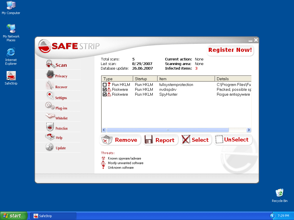 SafeStrip is a rogue antispyware application that promises to detect, remove and protect your PC from thousands of potential malicious programs. SafeStrip is usually installed by Trojans or comes through browser security holes. SafeStrip may bombard you with annoying popup ads and show you fake Warning messages in order to get you to obtain the full version of the program SafeStrip has the ability to reappear after removal; therefore the manual removal of this parasite can cause many difficulties.