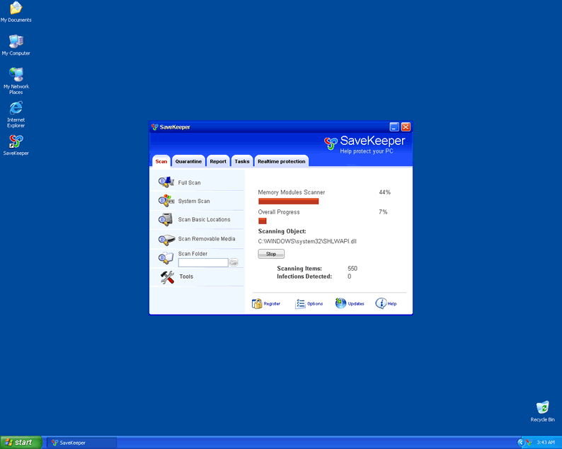 SaveKeeper, otherwise known as Save Keeper, is a fake spyware remover that takes after various other rogue spyware removers such as QuickHealCleaner, SystemCop, BlockDefense and SaveSoldier. SaveKeeper reports fabricated infection results following fake system scans, as well as displaying fake security alerts. These help to scare you into purchasing and downloading the rogue spyware remover SaveKeeper.