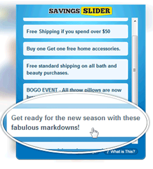 Savings Slider is an adware program that is known for displaying random advertisements of online shopping products as well as coupon deals. Through Savings Slider computer users may get redirected to unwanted sites offering savings on shopping sites. At times Savings Slider may interrupt web surfing on popular web browsers like Google Chrome, Firefox and Internet Explorer. The removal or uninstallation of Savings Slider may be performed using an updated antispyware application.