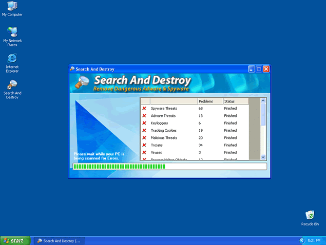 SearchAndDestroy is a rogue anti-spyware application that reports exaggerated spyware results. Once installed, SearchAndDestroy will automatically load and scan your system only to display false positives in hopes of tricking you into buying the full version of the program. SearchAndDestroy has no affiliation to Spybot Search & Destroy. SearchAndDestroy program may be difficult to remove manually, and will continue to try to recreate itself.