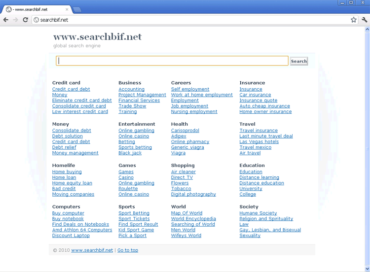 Searchbif.net pretends to offer both search engine features and categorized links according to interests like credit cards, shopping and sports, but Searchbif.net's reputation has preceded it as a bad place to start online searches for anything whatsoever. Searchbif.net is noted for its common ground with such sites as Supersearchport.net, Supsearch.net, Basic-search.net, Clipssearch.net, Macsearch.net, Cutsearch.net, Supersearchs.net and Lightssearch.net, all of them employing the same types of bait and switch hoaxes that use fake search results to expose you to harmful and irrelevant websites. Although most reports of contact with Searchbif.net involve browser hijackers that utilize redirects attacks, SpywareRemove.com malware researchers have also discovered that links to Searchbif.net may be propagated by spam (unsolicited and mass-distributed e-mail messages, instant messages and other textual communications).