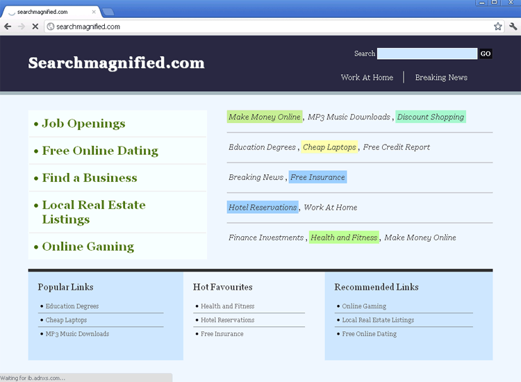 SearchMagnified.com looks like an online search site with bundles of useful and informative links, but this aesthetic facade is just a template for SearchMagnified.com to hide its real intentions, which are somewhat more sinister than being a Google replacement. Victims of SearchMagnified.com have reported everything from unwanted advertisements to online scams to the presence of malicious software, and you should anticipate the possibility of any of the above if you were to have the misfortune to be redirected to SearchMagnified.com.