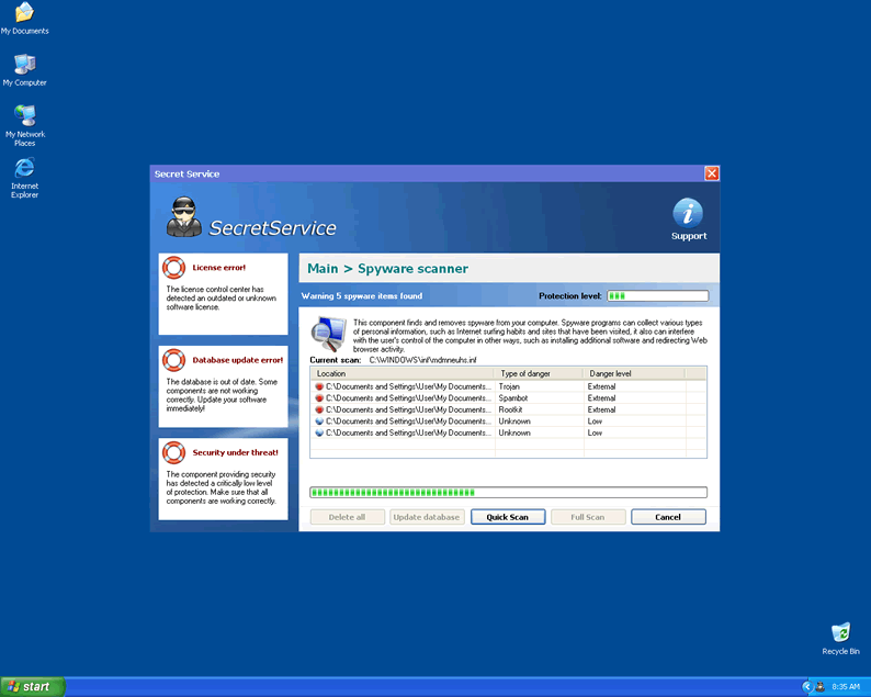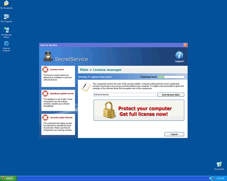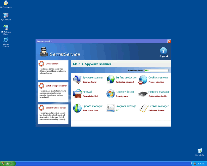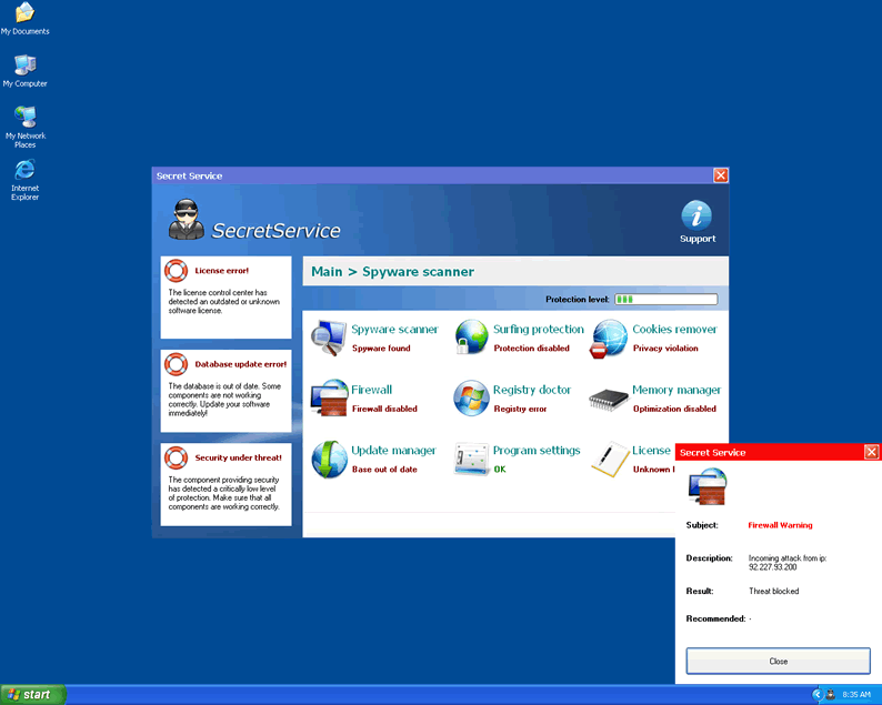 Secret Service is a fake spyware remover hailing from the developers of another rogue spyware remover called Crusader Antivirus. Secret Service is propagated through rogue websites that have malicious scripts embedded in their codes, or through trojans that infiltrate via security exploits. Once active, Secret Service reports fake infection results accompanied by annoying pop-up advertisements, all in order to scare you into following the prompts and purchasing the fake spyware remover Secret Service to help combat these non-existent threats.
