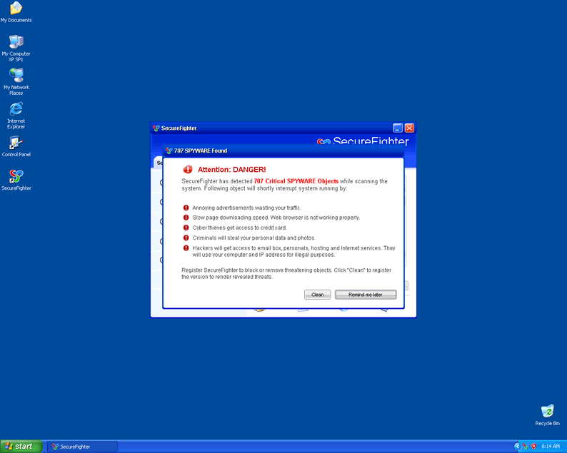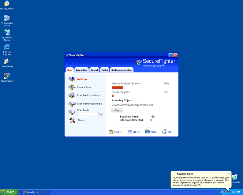 SecureFighter or Secure Fighter, is a rogue anti-spyware program that is designed to fabricate many security alerts and return bogus parasite scan results to convince computer users that their system is infected with parasites. SecureFighter comes from the same group of attackers that develop and spread the rogue security applications called Secure Veteran, Security Soldier and Security Fighter.
