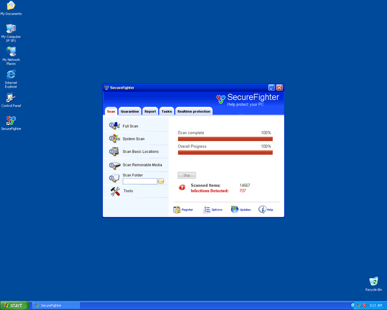 SecureFighter has the ability to create fake files and later detect them in a system scan as a scare tactic to further mislead users into purchasing the full version of SecureFighter. SecureFighter does not have the ability to detect and remove legitimate threats.