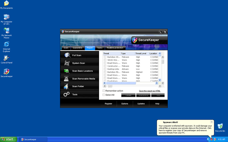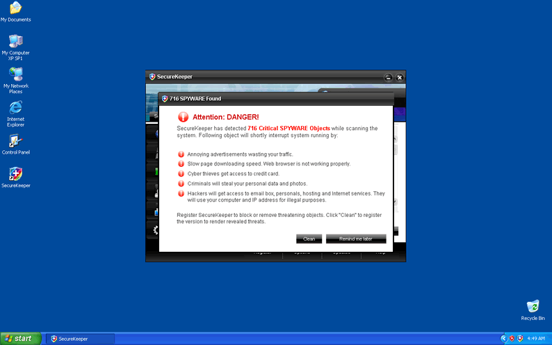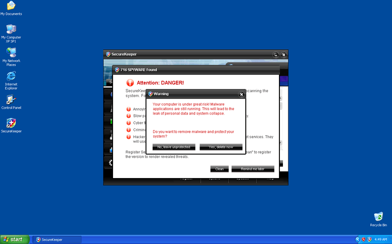 SecureKeeper, which is also called Secure Keeper, is a Rogue Anti-Spyware Program from the notorious WiniGuard family. SecureKeeper injects the system with malicious Trojans which force changes to the Windows registry and delivers fake system scans. SecureKeeper does not need your permission to be installed, it steals in as a video codec or another tool. SecureKeeper will start threatening computer users by displaying different warnings and producing fake scan results. Do not trust the application. These are only tactics to make you spend money for nothing in return. Remove SecureKeeper upon detection to prevent system damage.