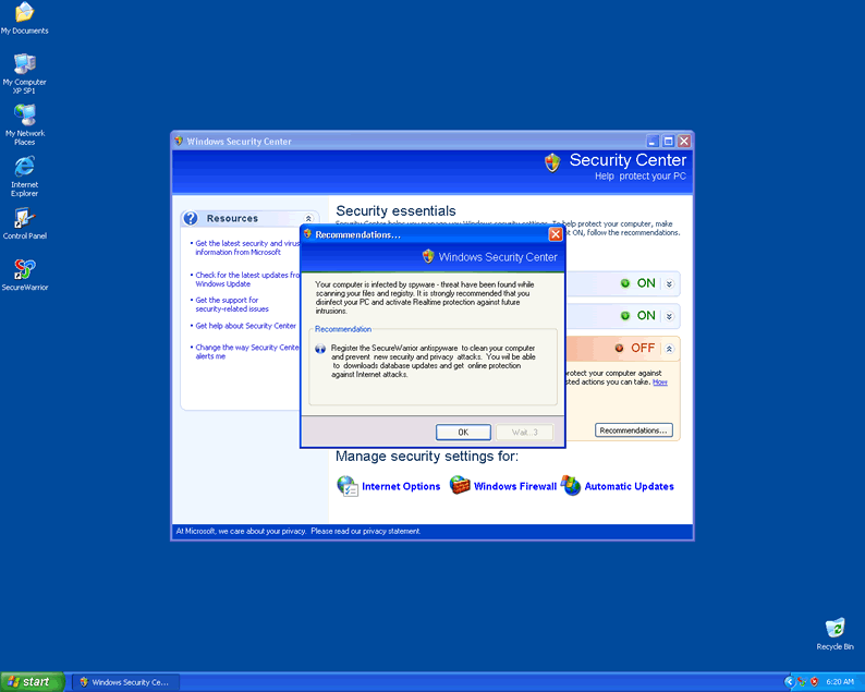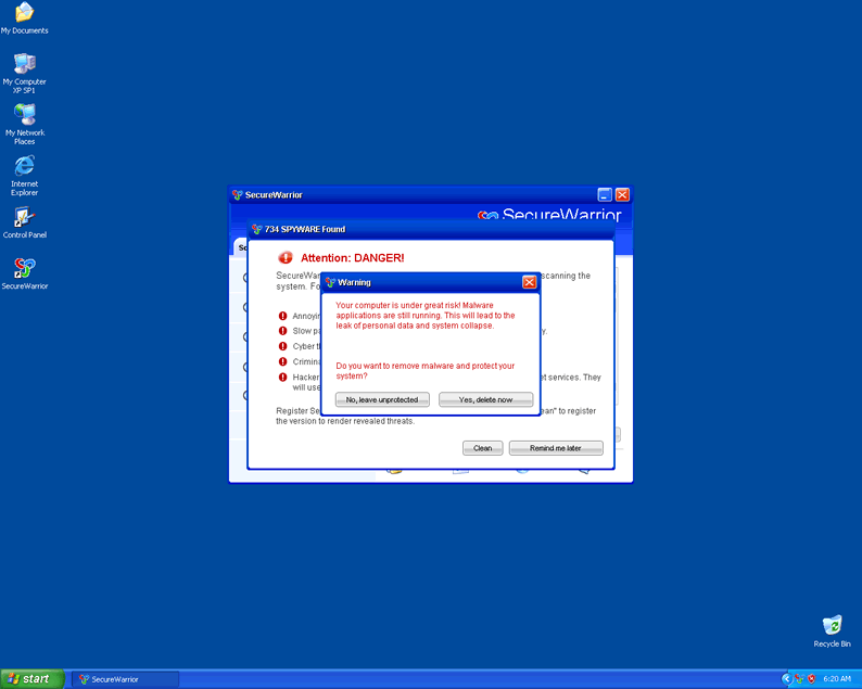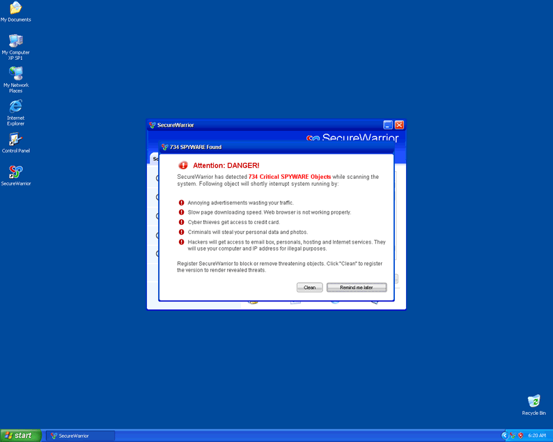 Secure Warrior or SecureWarrior, is a rogue application that uses deceptive messages and system scans to push computer users into purchasing a full version of the Secure Warrior program. Secure Warrior, once installed, will fabricate system scan results and display several popup notifications to further pursued purchase of Secure Warrior. Secure Warrior comes from the same group of fake security programs WiniFighter, SecureVeteran, SoftSafeness, SafetyKeeper and BlockDefense.