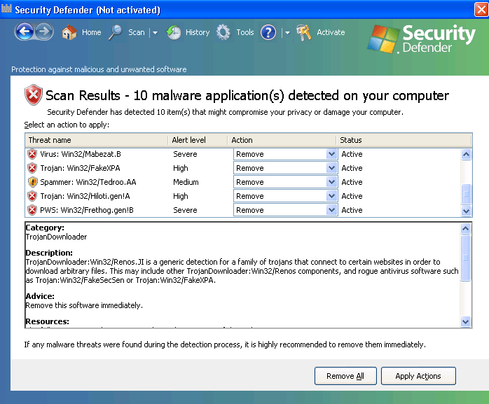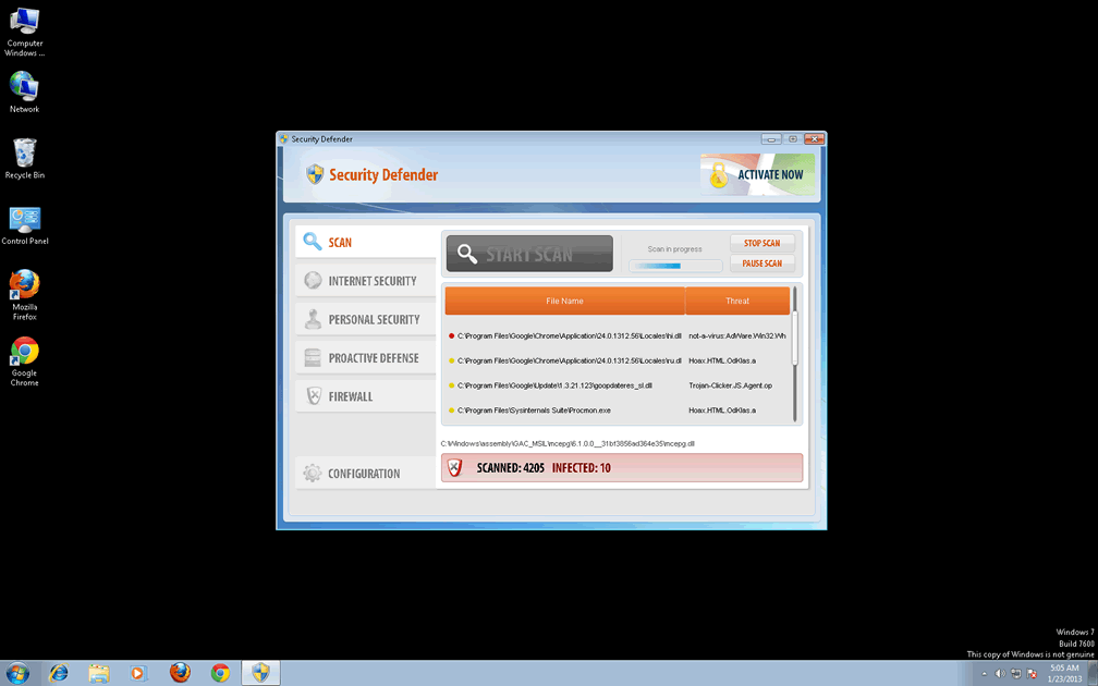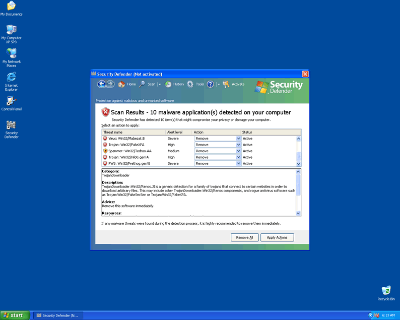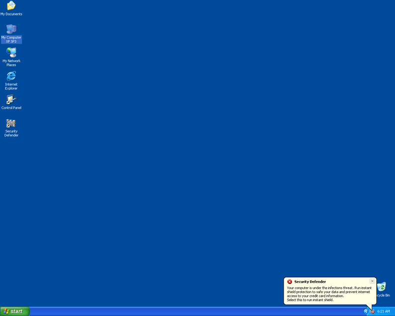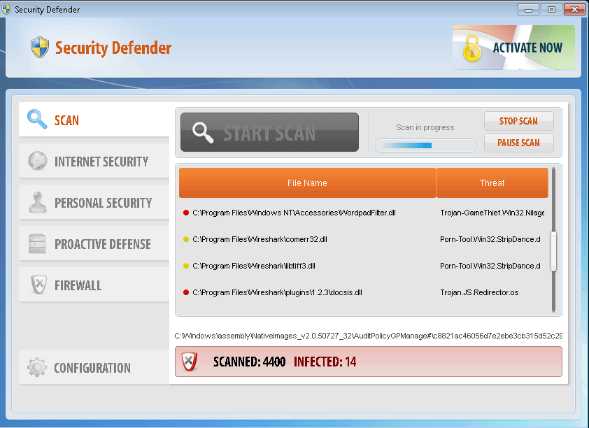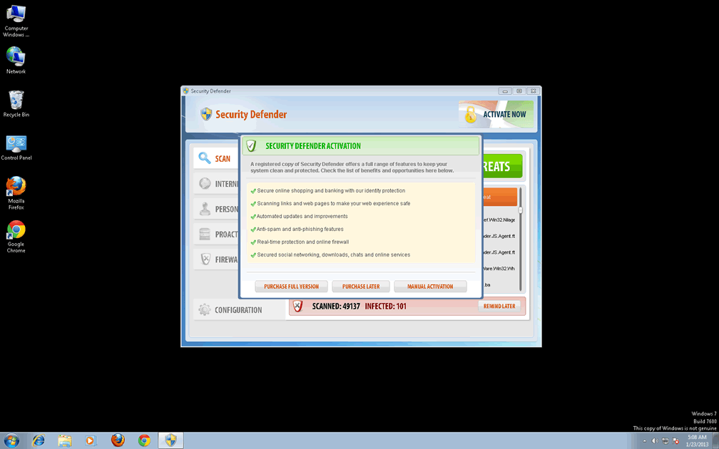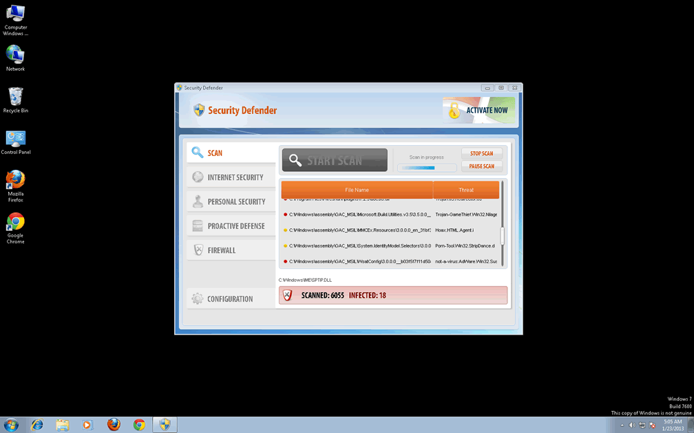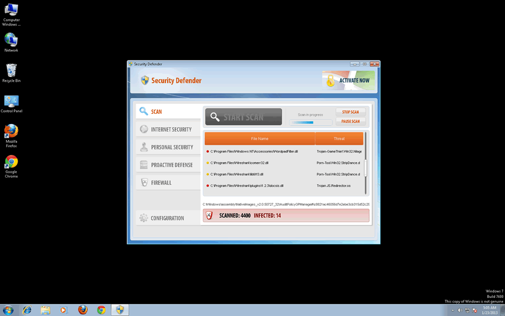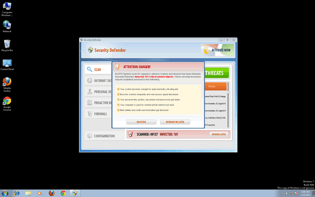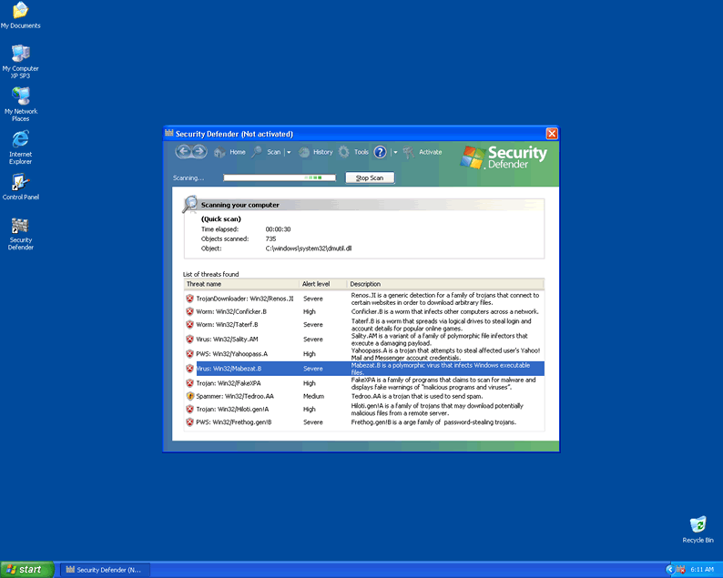Sometimes it can be difficult to tell whether you have a malware infection on your computer. Security Defender is happily a standout rogue that makes identification very easy. In fact, it can't wait to advertise its presence! It will run itself automatically rather than requiring a prompt, and will immediately detect many nonexistent threats. Despite these messages, Security Defender is physically incapable of actually scanning your computer, let alone removing serious threats, even in its supposed 'full' version.