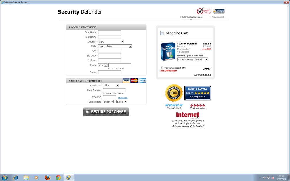 Another ironic trait that makes Security Defender a snap to identify is its rather morbidly enthusiastic marketing. This is a rogue that truly relies on you not knowing what it is to get the sale! It will engage in tactics such as creating popups or modifying your browser settings with a proxy server for redirection. Whatever foul tactics Security Defender takes always ends at the same goal, towards a purchase form for itself.