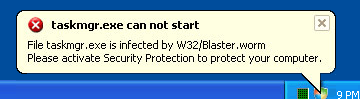 | 2 | taskmgr.exe can not start File taskmgr.exe is infected by W32/Blaster.worm. Please activate Security Protection to protect your computer. |