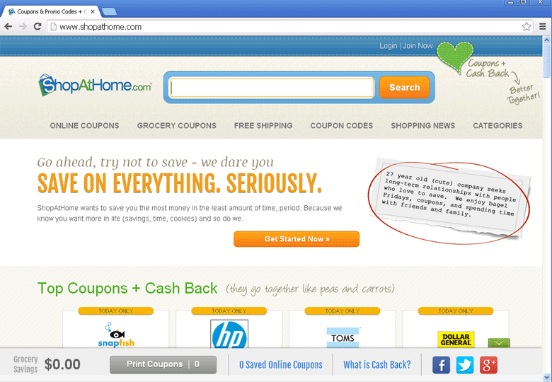 ShopAtHome.com is designed to resemble a legitimate online coupon tracker, but, in reality, is a purveyor of adware and other low-level PC threats without any legitimate coupon-acquiring features. Even set apart from its actual content, ShopAtHome.com has a history of attempting to rig community rating sites in its favor and promote itself through spam, making ShopAtHome.com a highly disreputable website once one digs past its shiny marketing surface.