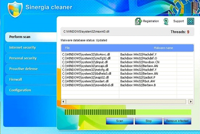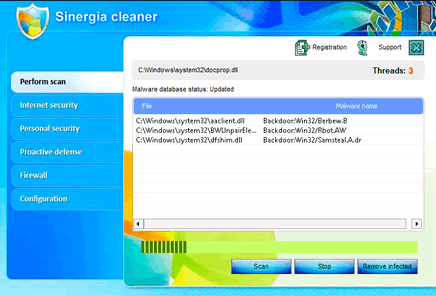 Although Sinergia Cleaner is designed to look like a standard anti-malware system scanner, Sinergia Cleaner has zero security features and includes numerous functions for disabling important security features for Windows PCs. Commonly downloaded and installed by various Trojans, such as BredoLab or Karagany, Sinergia Cleaner will set itself to launch as a baseline Windows component and modifies your Registry so that Sinergia Cleaner can monitor any executable program files as you try to launch them. In most cases, Sinergia Cleaner will block these programs while also claiming that they've been infected by threats that only can be removed after you've purchased the 'full' version of Sinergia Cleaner.
