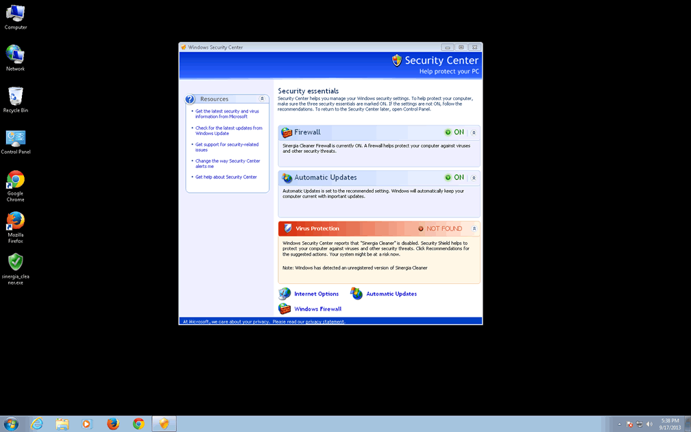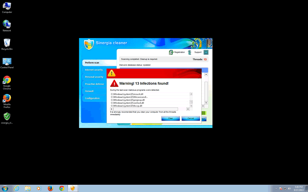 Sinergia Cleaner is a rogue anti-malware product based on a branch of the FakeRean family of scamware. By displaying fraudulent warning messages and scans with deliberately bad results, Sinergia Cleaner encourages victims to purchase its software – even though doing so has no effect other than wasting your money and giving your personal information to criminals. SpywareRemove.com malware experts have a long familiarity with the FakeRean family and always recommend using suitable anti-malware utilities to remove its members, and deleting Sinergia Cleaner always should be a priority for maintaining your PC's security.