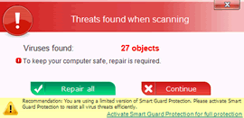 | 1 | Warning! Infected file detected. We strongly recommend activating full edition of your antivirus software for repairing threats. |