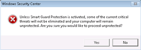 As potentially harmful as Smart Guard Protection's fake alerts and scans may be, Smart Guard Protection also includes a substantial sidearm of attacks meant to restrict your ability to use your computer at all. Smart Guard Protection should be expected to block many programs on your computer by focusing on security-related software, such as the Registry Editor, Task Manager and Windows Defender. Although Smart Guard Protection doesn't block Internet Explorer, Smart Guard Protection does hijack it and redirect that browser to fraudulent warning pages. The overall state of security for any PC infected by Smart Guard Protection may, therefore, be described as questionable.