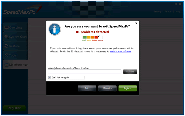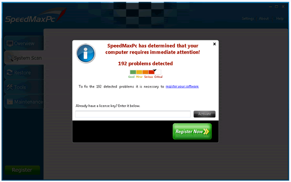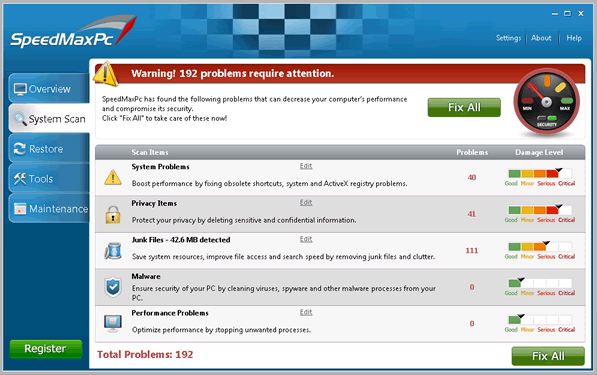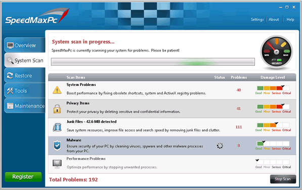 Although SpeedMaxPC claims to have various functions that can speed up your PC, SpeedMaxPC actually doesn't have any benign functions whatsoever and can't optimize your PC or otherwise help its performance. All of SpeedMaxPC's real features focus on delivering scans and alerts with fraudulent system information. More disturbingly than that, in some cases, SpeedMaxPC detects real files as problematic and deletes them, which may, in some cases, cause your computer to become completely unbootable.