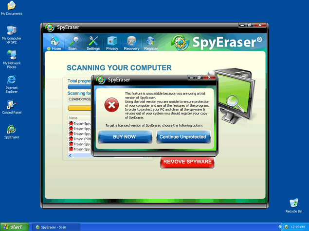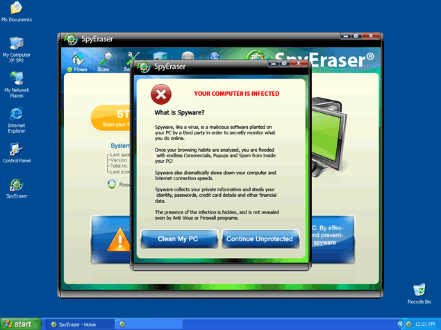 The invasion of SpyEraser into any computer system can result in undesired consequences like registry changes, file system control and potential PC slowdown. SpyEraser brings out a number of pop-up boxes and runs its scanners after each start-up. SpyEraser makes a user think his/her PC is at risk. SpyEraser claims to find malicious items on a user's machine and then asks for a payment to remove the malware. However, SpyEraser does not and is not able to detect any viruses because it doesn't have any functioning AV database at its disposal.