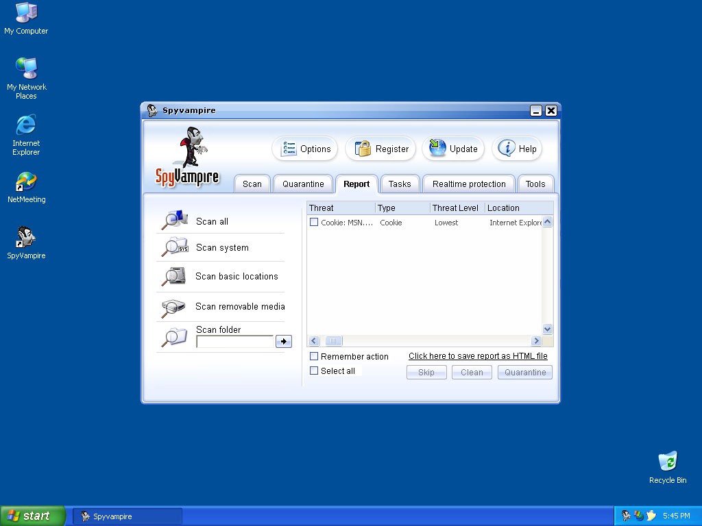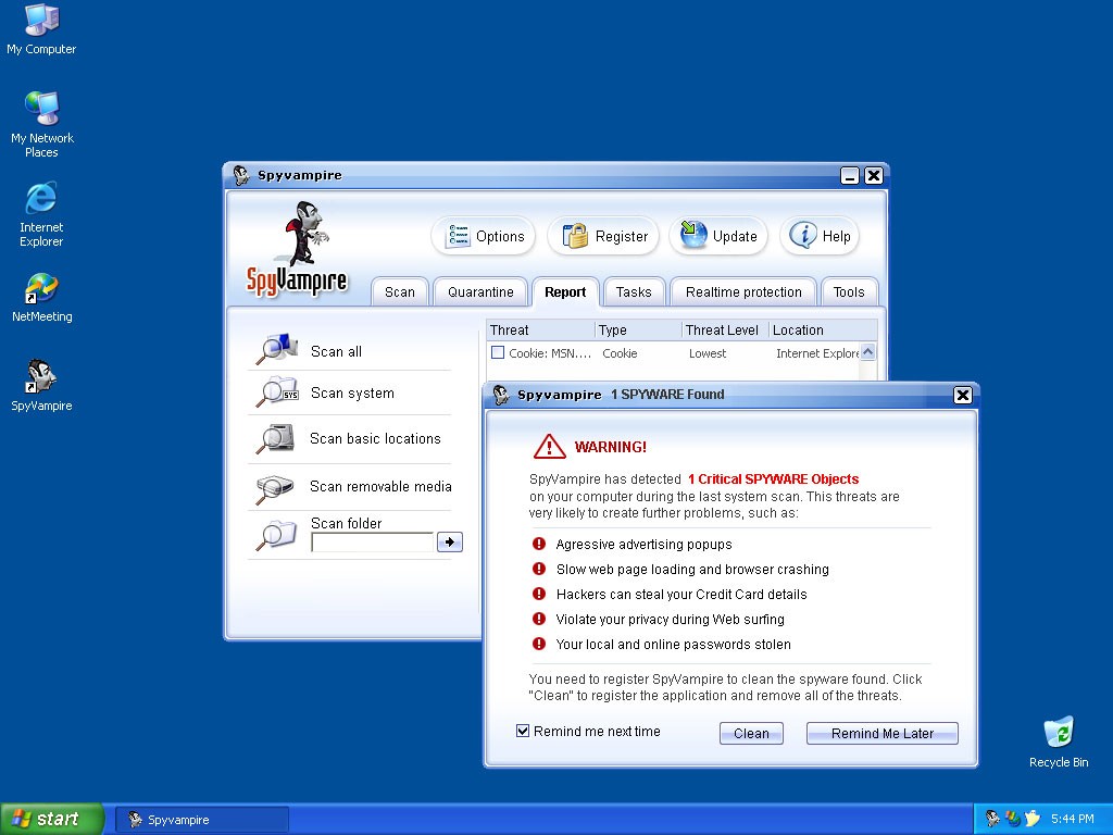 Once you're infected, the SpyVampire trojan will display fake security messages on your system tray and trick you into thinking that Microsoft Windows is reporting a spyware infection. Clicking on the fake SpyVampire message, directs you to SpyVampire's website to purchase the rogue anti-spyware program. SpyVampire is a variant of SpyLocked, SpywareLocked, SpyDawn and SpywareQuake. SpyVampire is considered a security risk and is recommended to be removed immediately.