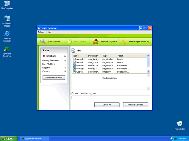 SpywareRemover is a malevolent parasite cloaked as a trustworthy anti-spyware application, and may be downloaded and installed onto your system by a Trojan through security system gaps. Once SpywareRemover is executed, it will perform a fake scan of your system and will display bogus warning messages stating that your security and privacy is violated by dangerous parasites. SpywareRemover will then try to trick you into purchasing its full version to eliminate the parasites it "detected". Immediate removal of SpywareRemover is strongly recommended.