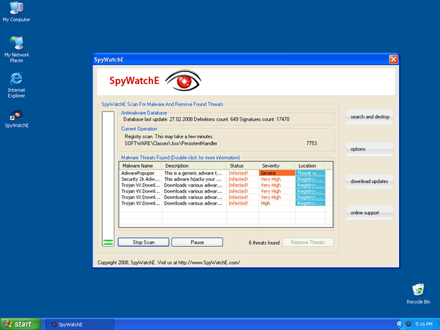SpyWatchE is a rogue anti-spyware application that creates warnings about spyware programs that aren't on your PC. Its aim in doing so is to encourage you to spend money to purchase its 'full' version, although neither version of SpyWatchE can find or remove actual PC threats. SpyWatchE, like many types of scamware, is often installed by Trojans such as Zlob or Vundo, and may also include secondary functions such as browser redirect attacks, creating junk files or spawning legions of pornographic pop-ups. SpywareRemove.com malware analysts suggest that you avoid likely sources of infection by SpyWatchE, such as fake codec downloads, whenever possible, and delete SpyWatchE with qualified anti-malware products if you do have the misfortune to be attacked by SpyWatchE.