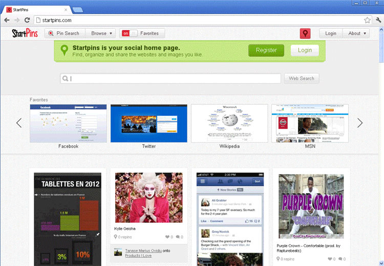Startpins.com is a website that claims to offer social bookmarking and favorite website/image features. To be fair to Startpins.com, SpywareRemove.com malware researchers haven't seen any signs of Startpins.com going back on its word regarding its site functions, but these mild features are overwhelmed by Startpins.com's drawbacks – as just one more destination for browser hijackers to promote in their browser-altering attacks. Browser hijackers that redirect you to Startpins.com have been seen recently in fake software updates, although similar low-level PC threats are often distributed by other methods (such as by bundling with programs distributed widely throughout torrenting networks and shareware sites). If you do find your browser going to Startpins.com again and again, you should use a choice anti-malware product to remove all components of the browser hijacker to get your web-surfing away from Startpins.com and back to your favored sites.