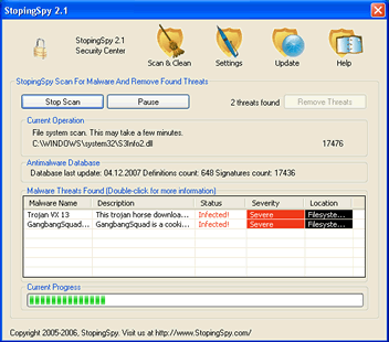 StopingSpy is a rogue antispyware program that uses deceptive tactics to trick you into purchasing their software. Once you're infected with StopingSpy, a security message similar to a Windows notification pops up saying your PC is infected with malware. This fake message is used to lure you into purchasing, downloading and installing their program to remove the imaginary spyware. StopingSpy program can be extremely difficult to remove manually, and will continue to try to recreate itself. StopingSpy is cloned from various well known rogue software products, such as DrAntiSpy, BraveSentry and SpyShredder.