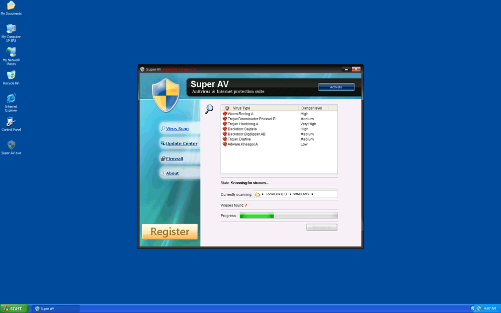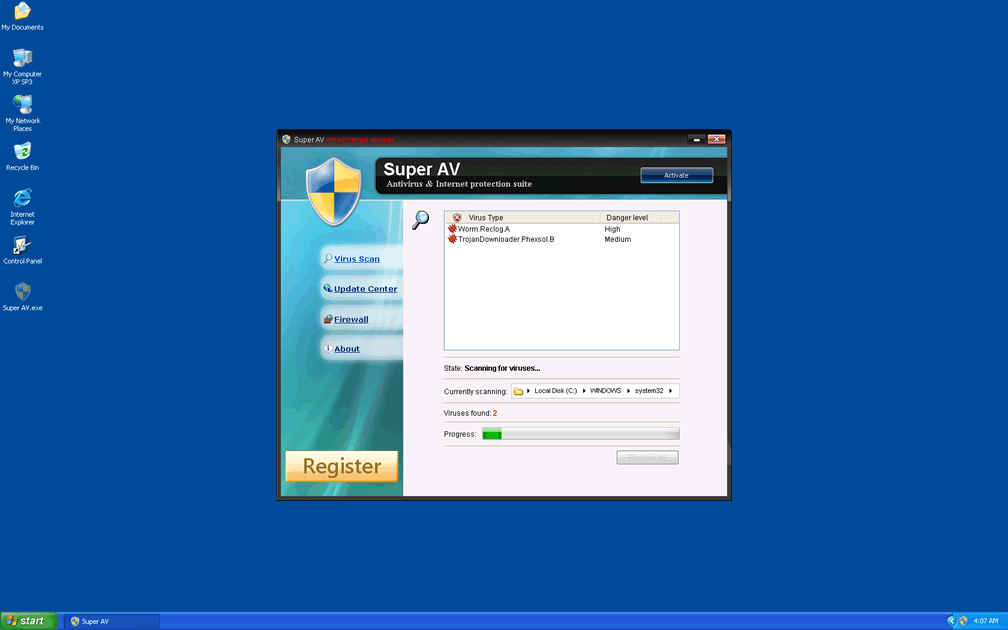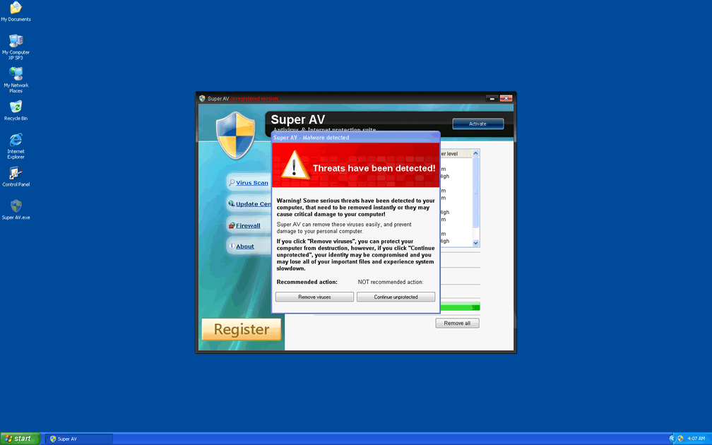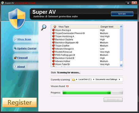 Super AV is a clone of other FakeScanti-based scamware such as Security Guard, Sysinternals Antivirus, WireShark Antivirus, Milestone Antivirus, BlueFlare Antivirus, Wolfram Antivirus, OpenCloud Antivirus, OpenCloud Security, Data Restore, AV Guard Online, Cloud Protection, AV Protection Online, System Protection 2012, AV Security 2012, Sphere Security 2012, AV Protection 2011, Security Guard 2012, Super AV 2013 and OpenCloud AV. As such, Super AV uses both the same interface and the same types of fraudulent pop-ups. Although Super AV tries to look professional with a generic shield icon and a Windows-standard type of firewall icon, all of Super AV's advertised features – its self-update function, its virus detection function, its system scanner and even its virus removal abilities are wholly-fake. You should ignore error messages and other warnings that may have originated from Super AV, since these warnings lack any basis in reality and may lead you into performing actions that are harmful for your PC.