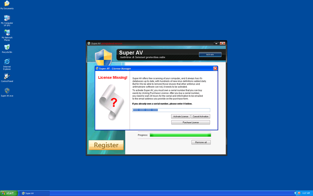 Super AV is a malicious anti-virus program that uses inaccurate pop-up alerts and scanner results to make it appear as though a horde of rootkits, keyloggers and other forms of high-level PC threats are infecting your computer. Even though Super AV has the appearance of a standard anti-virus scanner and offers to remove everything that Super AV detected if you'll spend money on registering Super AV, registration or purchase of Super AV is discouraged by SpywareRemove.com malware researchers who have found that Super AV has no genuine virus detection or removal features. As is commonly-true of rogue anti-virus programs, Super AV will continue to flood your screen with fraudulent alerts, regardless of the real state of your computer's health, until you remove Super AV with a real anti-malware program.
