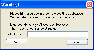 Survey Warning Ransomware is a semi-innovative form of ransomware Trojan that asks you to fill out a survey at an indicated site to receive an unlocking code for your PC. Until this is done, Survey Warning Ransomware will refuse to let you use your desktop or other programs – even though the 'survey' site that Survey Warning Ransomware indicates actually is a verified hotbed for malware distribution and phishing attacks. If you see Survey Warning Ransomware's pop-up attack, SpywareRemove.com malware experts suggest disabling Survey Warning Ransomware without trying to unlock Survey Warning Ransomware, and then using a suitable anti-malware product for deleting Survey Warning Ransomware appropriately.