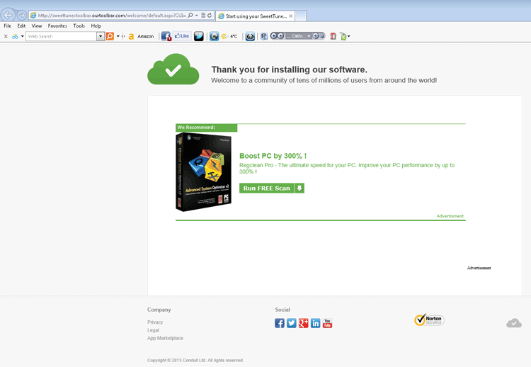 Malware experts have examined the Conduit site through long experience with many other toolbars similar to the Sweet Tunes Toolbar and don't currently categorize Conduit.com as an infection vector. Nonetheless, search results acquired with the help of the Sweet Tunes Toolbar or sites promoted by the Sweet Tunes Toolbar may not always be accurate, and, of course, being unable to set your own homepage or search engine is a significant negative that warrants deleting the Sweet Tunes Toolbar fairly rapidly.